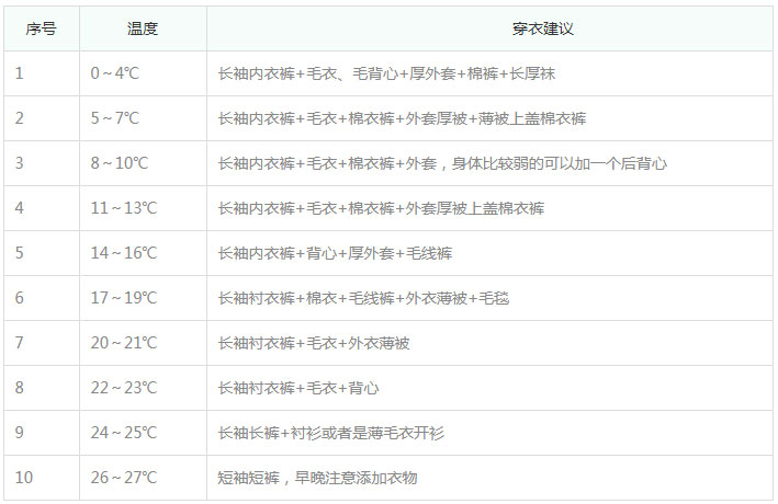 以上就是宝宝穿衣温度的参考表,但是需要知道的是,没有必要完全按照上面的进行穿,因为每个宝宝对于温度的感知都是不同的,胖一点的宝宝可以适当的见一些衣服,而瘦一点身体弱一点的宝宝可以适当的增加衣物,具体是因人而异的。