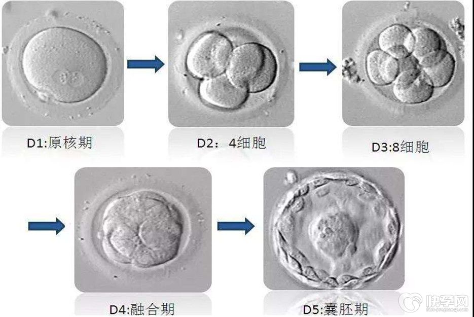 当挑选出来后的卵子和精子经过人工处理后,形成受精卵后,受精卵一般就会在第二天进行分裂成多个细胞形成胚胎。试管胚胎可分为鲜胚和囊胚两种方式,两种胚胎都有各自的标准等级划分。而试管胚胎的培养过程一般分为五个阶段,分别为:D1:原核期;D2:4细胞;D3:8细胞;D4:融合期;D5:囊胚期。