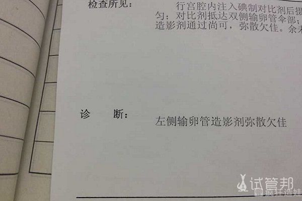 我还是有点怀疑医生的建议,因为我都还没怀过孕,另外就是怕疼。我妈也给做了思想工作,最终还是决定3月份去输卵管造影,医生说输卵管造影对于轻度堵塞的情况还可以起到疏通的作用。造影检查手术过程,扩宫和插管是最痛的时候,插上管子后一直就下腹坠胀,还有想大便的感觉,上又上不出来,排队做B超检查,等了20多分钟,疼的脸发白。终于轮到我,躺在床上,检查医生用注射器推造影剂,推注时,只感觉右侧胀痛,左侧没有感觉。检查就几分钟,然后就在外面等结果。右边痛左边不痛,我自己觉得有可能右边不通吧。结果出来也就是这样,右边堵塞,左边通畅。医生说这种情况,一边是通的可以尝试自己怀孕,但由于年龄因素,医生又说如果着急怀孕,也可以直接做试管。