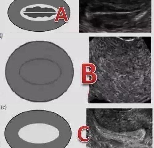 目前子宫内膜的形态主要分为三型:A型为三线型子宫内膜,外层和中部强回声,内层为低回声,宫腔中线回声明显;B型为弱三线型,宫腔中线回声不明显;C型为均匀强回声,无宫腔中线回声。
