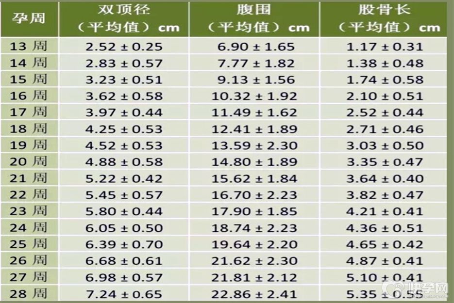 孕14周平均值为28mm,孕15周为32mm,孕16周为35mm,孕17周为38mm,孕18周为42mm,孕19周为45mm,孕20周为48mm,孕21周51mm,孕22周为55mm,孕23周为58mm,孕24周为61mm,孕25周为64mm,孕26周为67mm,孕27周为70mm,孕28周为73mm,孕29周为75mm,孕30周为78mm,孕31周为80mm,孕32周为83mm,孕33周为85mm,孕34周围87mm,孕35周为89mm,孕36周为91mm,孕37周为94mm,孕38周为95mm,孕39周为95mm,孕40周为96mm。