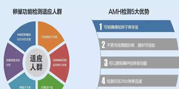 1、 通过AMH检查,可以知道女性卵巢中卵子的库存数量,对女性的卵巢功能和生育能力做出一个较为准确的预测和判断(一般,超过4毫米的卵泡可释放出0.25的AMH)。
