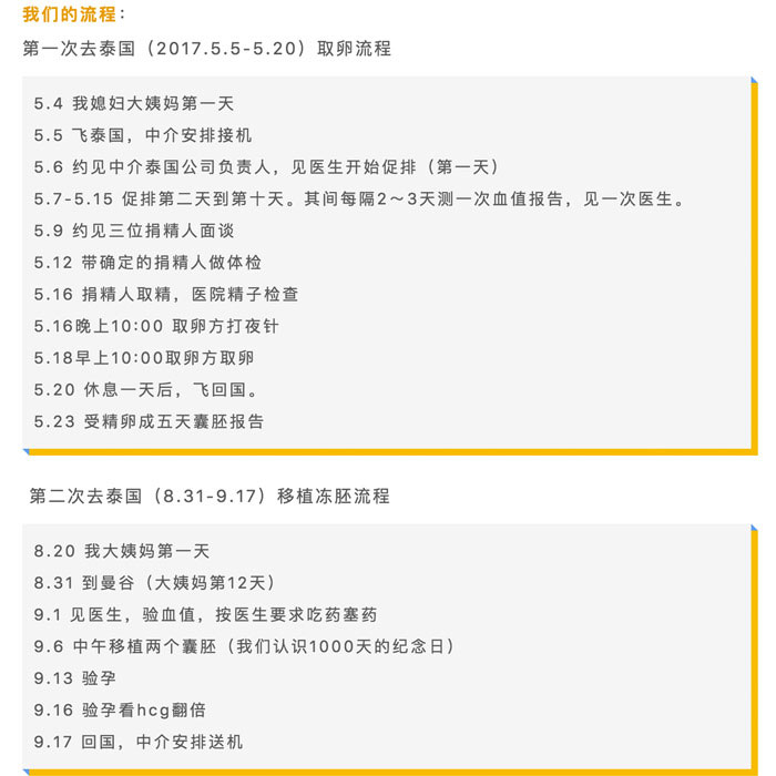 以上是中国试管婴儿网客户根据医旅顾问行程规划整理而来的行程表,清晰的展示从国内检查到赴泰面诊医生、促排取卵、胚胎移植的整个泰国试管的具体流程,历时3个月留泰时间30天,而后成功怀孕,并在18年7月初诞下健康的男宝。V0p育儿资讯网-试管常识全方位解读,助您开启好孕之旅