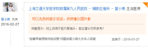 上海九院辅助生殖科医生冒小燕建议国内患者赠卵生育考虑国外