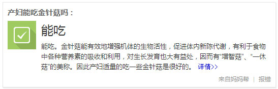 2、产后妈妈如果出现记忆力下降,情绪不佳,可以食用金针菇有提高免疫力和智力的功效。但是宫主建议脾胃虚寒的妈妈要少吃。